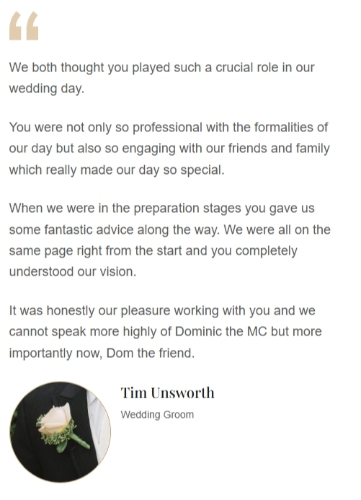 Having a master of ceremonies wasn’t something me and my husband had considered until my mum suggested we book Dom after meeting him at a wedding fair, but I am glad we did. It was great not to have the pressure of the job on any of the wedding party so everyone was free to enjoy the day, and I did not worry for one moment about everything not being under control as I had complete faith in Dom.