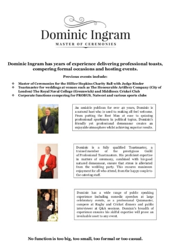 Dominic is a trained and experienced MC and Toastmaster based in Bedfordshire, providing his services across the Midlands and South East of England, bringing professionalism, distinction and ceremony to the occasion of your wedding or other event.
