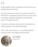 He was friendly and professional throughout the process, took time to understand who we were and what we wanted for our day, and did a great job of wrangling guests and speaking during the meal. I would definitely recommend a master of ceremonies and Dom in particular to add an air of grandness to your big day.